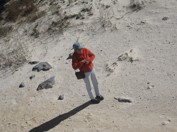 A person with a red jacket and a black purse is standing on a beach with sand and small pebbles.