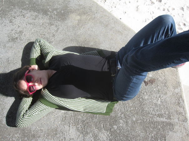 There is a girl dressed in jeans and a black shirt with a green checkered sweater and red sunglasses laying on the ground.