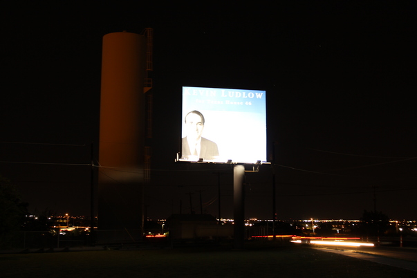 This is a picture of a Kevin Ludlow sign, at night in a city illuminated by city lights.