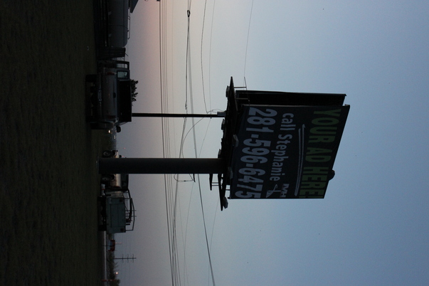 Two work trucks are parked under a large billboard that advertises the opportunity to have "your ad here" by calling Stephanie.