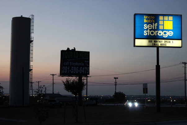 There is a nighttime picture of a sign that says Uncle Bob's self storage.