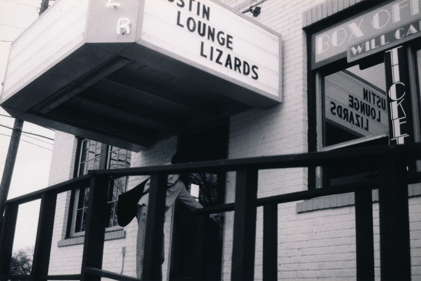 A black and white photo of a man with a satchel opening the door of movie theatre. |