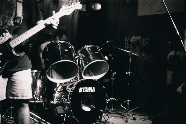 A dynamic, vivid picture of a drum kit set up at a show for a band. |