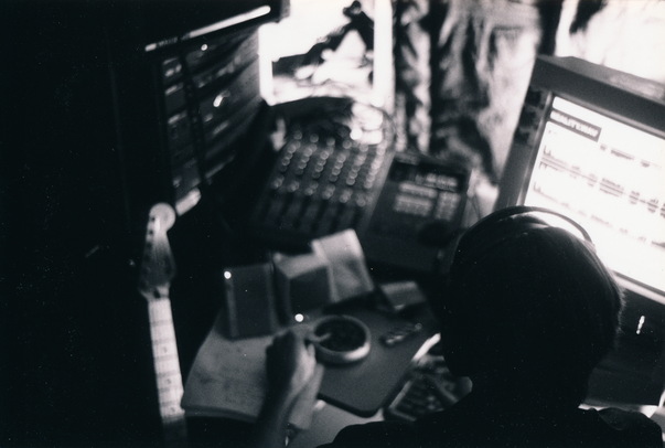 The person is at their desk in from of the screen wearing headphones while working. |