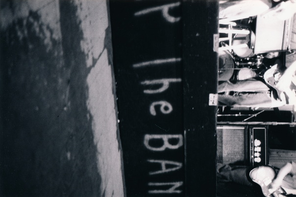 The band played on stage with a spray paint written sign in front of them to deter the crowd from coming up. |