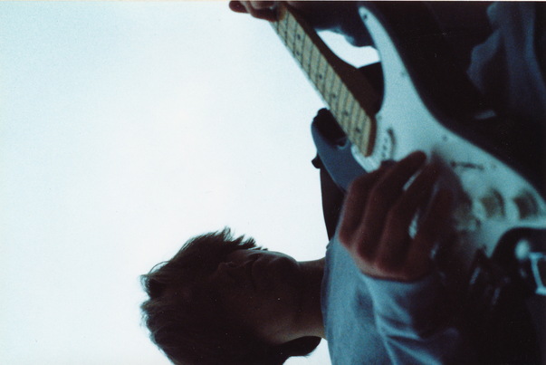 A blurry picture of a guy playing an electric guitar outside. |