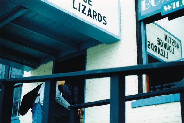 A man opens a door to go inside a building where "Austin Lounge Lizards" are listed on the marquee. |