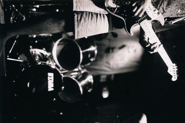 This is a moody black and white photo of a guitar player and a drum set in the background. |
