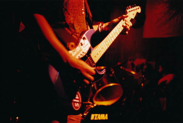A darkly lit photograph displays a man playing a guitar with other band members performing in the background. |