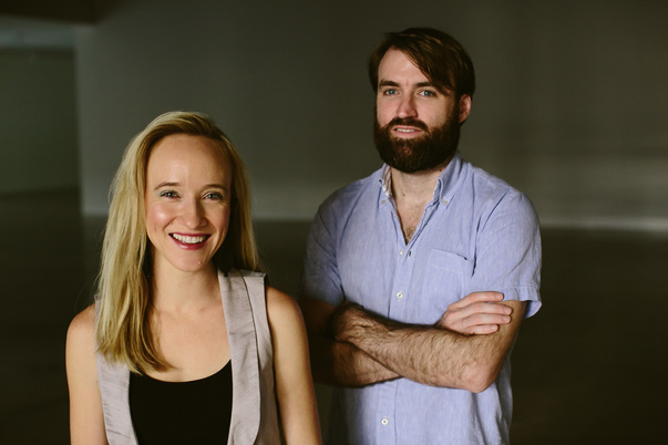A man with beard is standing beside a blonde woman, smiling.
