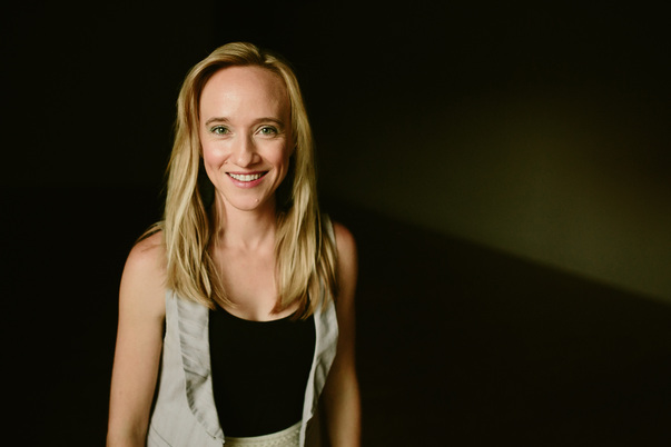 A girl with black tank and grey jacket is standing and smiling