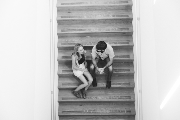 A couple is sitting in a staircase and talking with each other.