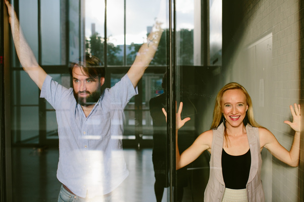 A man and woman standing behind a large glass wall while pressed up against it in a provocative manner.