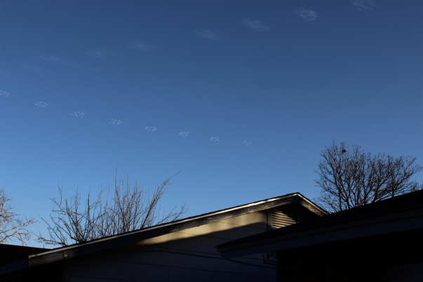 Essentially 5 bomber-looking prop planes flew in formation and spewed out the gas almost like a dot-matrix printer. It was really amazing to watch!