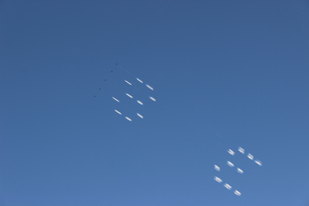 Essentially 5 bomber-looking prop planes flew in formation and spewed out the gas almost like a dot-matrix printer. It was really amazing to watch!