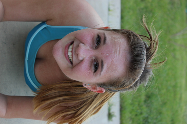 This is a picture of a lady laying on the ground with a blue shirt on.