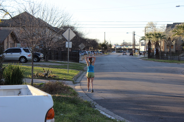 Woman in a turquoise tank top in a street with hands over her head.