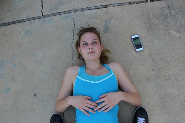 Woman in a blue tank top lying on the ground next to a cellular phone.