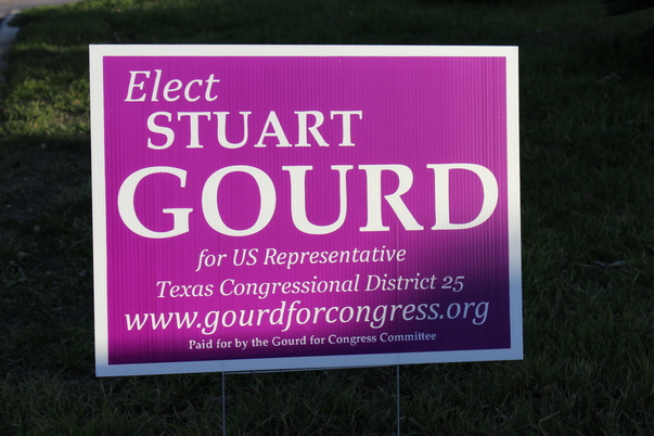 There is a purple sign in a grass lawn that says "Elect Stuart Gourd for US Representative Texas Congressional District 25".