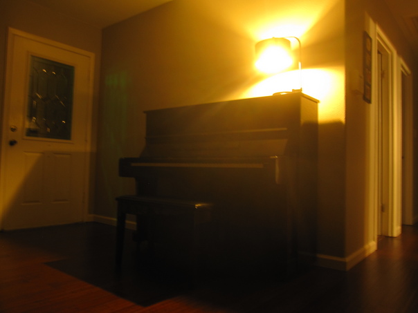 An upright piano sits near a door with a glass panel, a light above is giving off a yellow glow.