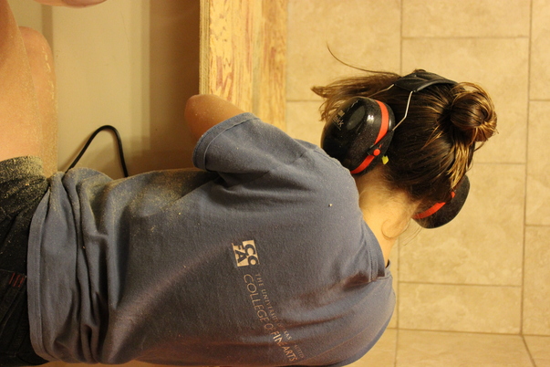 The process consisted of projecting her original drawing onto the plywood, tracing the pattern out, and then cutting away all of the low areas.