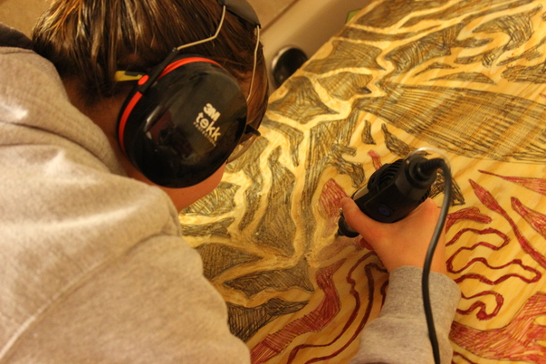 The process consisted of projecting her original drawing onto the plywood, tracing the pattern out, and then cutting away all of the low areas.