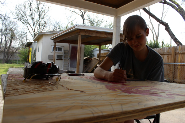 The process consisted of projecting her original drawing onto the plywood, tracing the pattern out, and then cutting away all of the low areas.