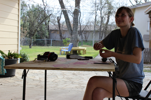 There is a girl smiling and working on a project at a table.
