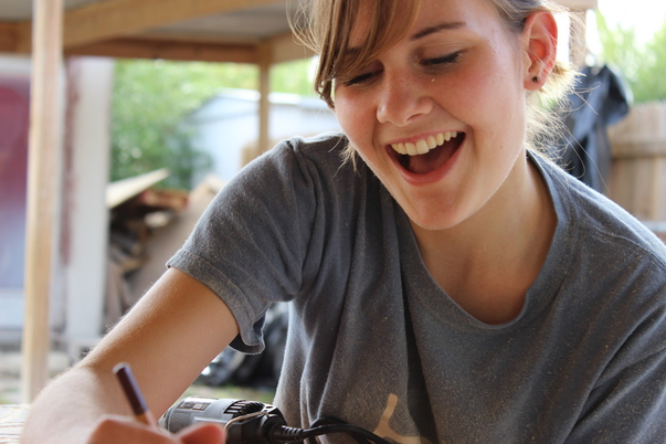 A woman in a grey t-shirt smiling widely while holding a pen in her right hand.