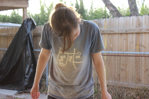 The brown haired girl wearing the gray t-shirt with a funny design on it is looking at the ground.