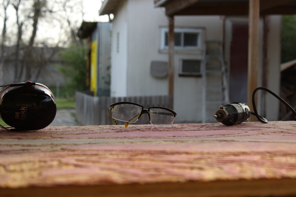There are some goggles and a power tool on top of a table outside.
