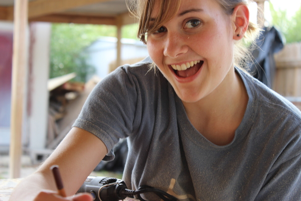 A lady smiling as she is doing some kind of work.