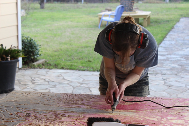 The process consisted of projecting her original drawing onto the plywood, tracing the pattern out, and then cutting away all of the low areas.