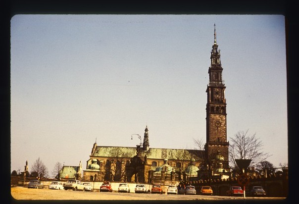 parked cars in front of a church, this image is many years old. I rate it comes out of the GDR, because the of the vehicles. |
