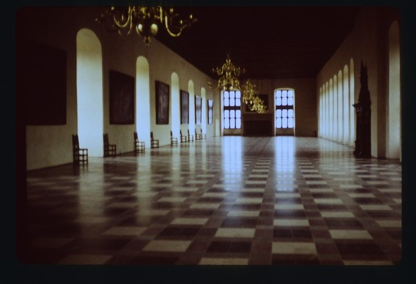Displays a long hall with down lighting. Fully tiles. This hall looks like a palace room. |