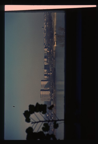 A panoramic photo of a river and a city at dusk looks calm and comforting. |