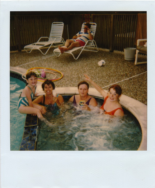An old polaroid of three women and a girl in a pool while a man lounges on a chair in the background.