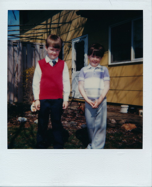 An old polaroid of two young boys, one in a red vest and the other in a striped polo.