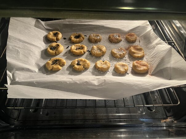 Since the recipe for the potatoes called for 6 egg whites, I had 6 yolks left over. So I decided to make some egg yolk cookies. They all came out amazingly well, but the jelly ones were SO good that we had to make another batch.