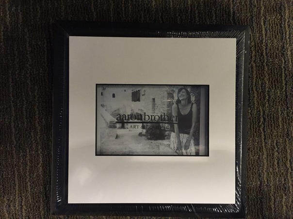Black Framed photo of a woman with the word aaron brother across the front.