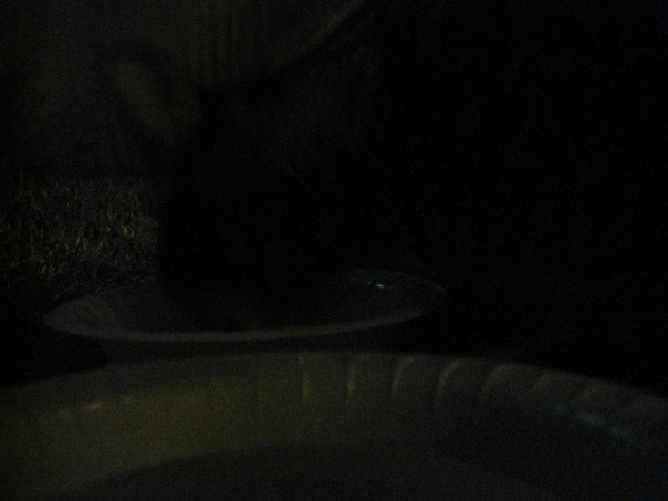 The disposable Styrofoam bowels are barley visible in the darkness.