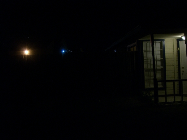 A bright white light and a bright blue light can be seen over a wooden fence of a small house at night.