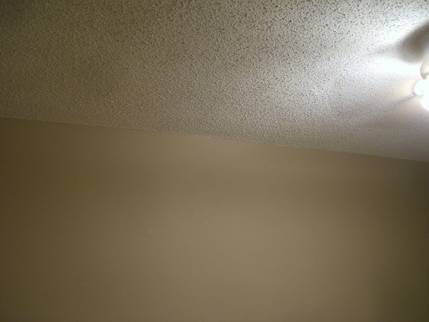 This photo depicts an upperhand corner of the room where a beige wall meets a ceiling with popcorn, and with a small light in the corner.