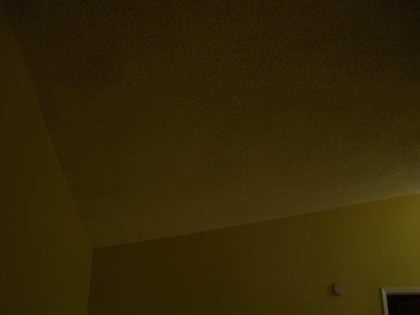 a darker picture of a ceiling and in slight view on the bottom right a doorway with a white frame.