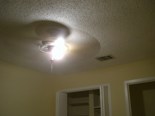 newly painted popcorn ceiling, light reflecting on ceiling, pale yellow walls
