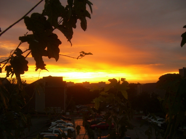 Sunrise over apartment complex.