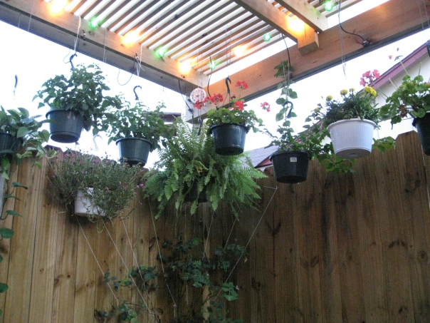 a picture of multiple flowers hanging from pots with green grass hanging down.