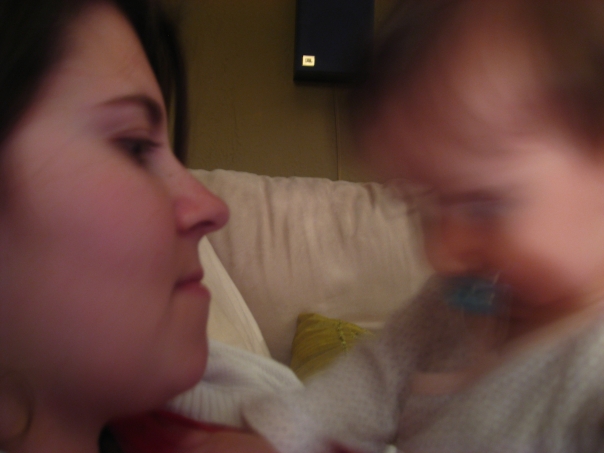A blurry action shot of a mother either moving her child towards or away from herself.