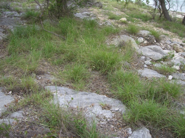 The landscape is covered with grey rocks and green grass in the wilderness.