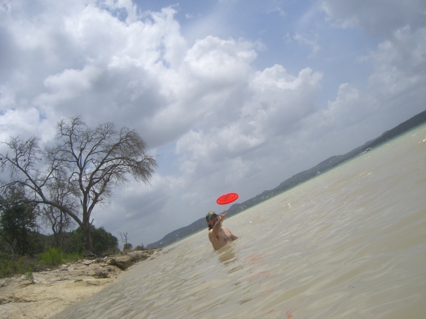 white guy in a green hat throwing a red frisbee while standing in water